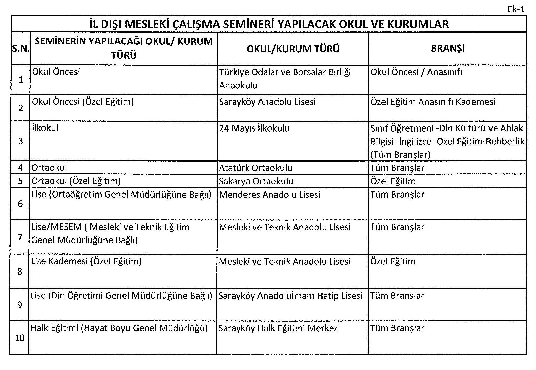 2024-2025 Eğitim Öğretim yılı sene sonu mesleki çalışmaların yapılacağı okul ve kurumlar aşağıdaki tabloda belirtilmiştir.